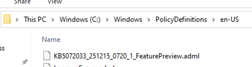 You will need the GPO template. You can download it from here: Windows 11 24H2, Windows 11 25H2 and Windows Server 2025 KB5072033 251215_07201 Feature Preview.msi