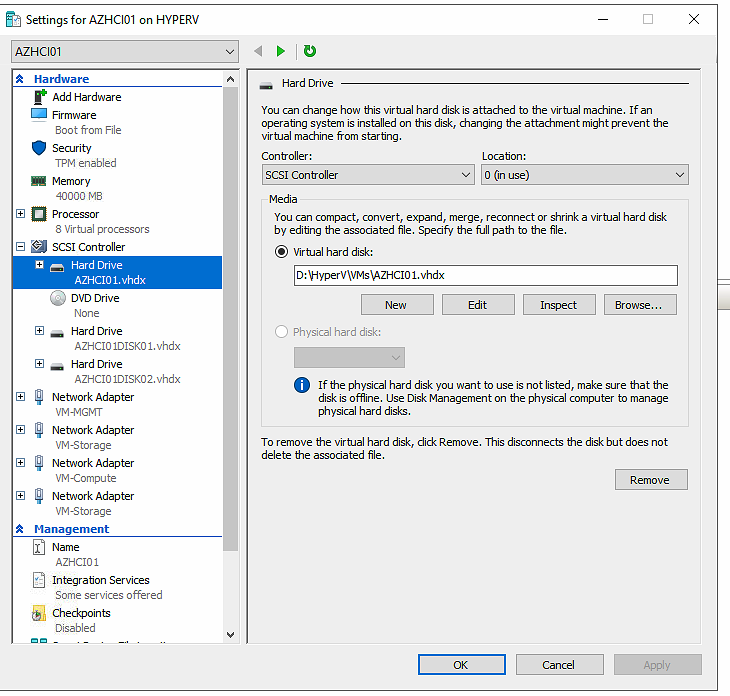 I has to make sure there was a decent amount of memory in the physical hardware. Even powerful workstations with 64 GB memory would struggle to provide me with a working homelab, since each Azure Local node require a minimum of 32 GB memory, and the physical hypervisor would also need available memory.