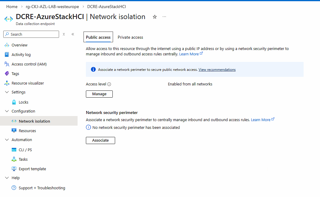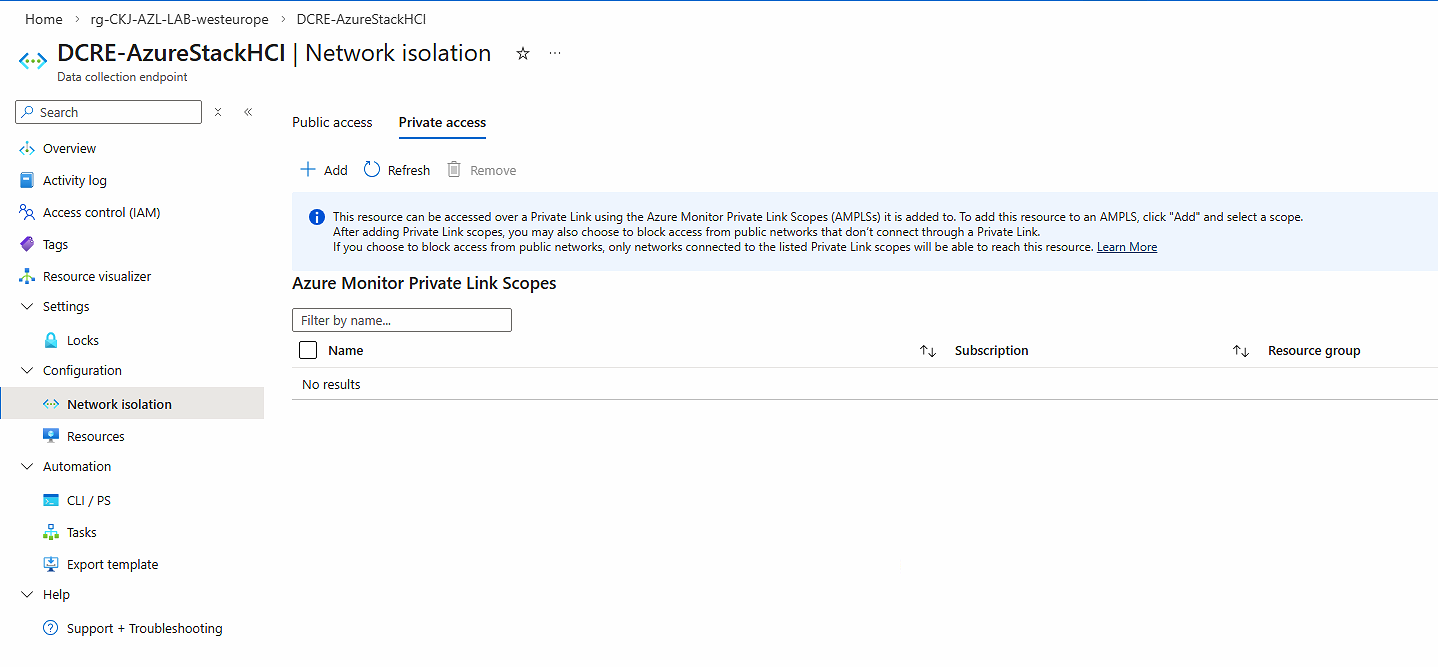 Take note that the Data Collection Endpoint supports private link Scopes (AMPLS). This is great if your nodes are not able to talk to Azure public endpoints because of firewall restrictions. You can configure your Date Collection Endpoint to communicate via AMPLS and ensure your Azure Local nodes can use Azure Private DNS resolution.