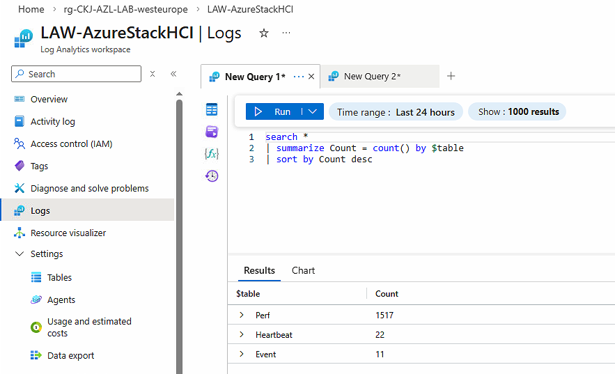 If you would like to know what tables in the Log Analytics Workspace that Azure Local nodes sends logs to, here is a quick KQL query that tells us that we are seeing logs in Perf, Heartbeat and Event tables