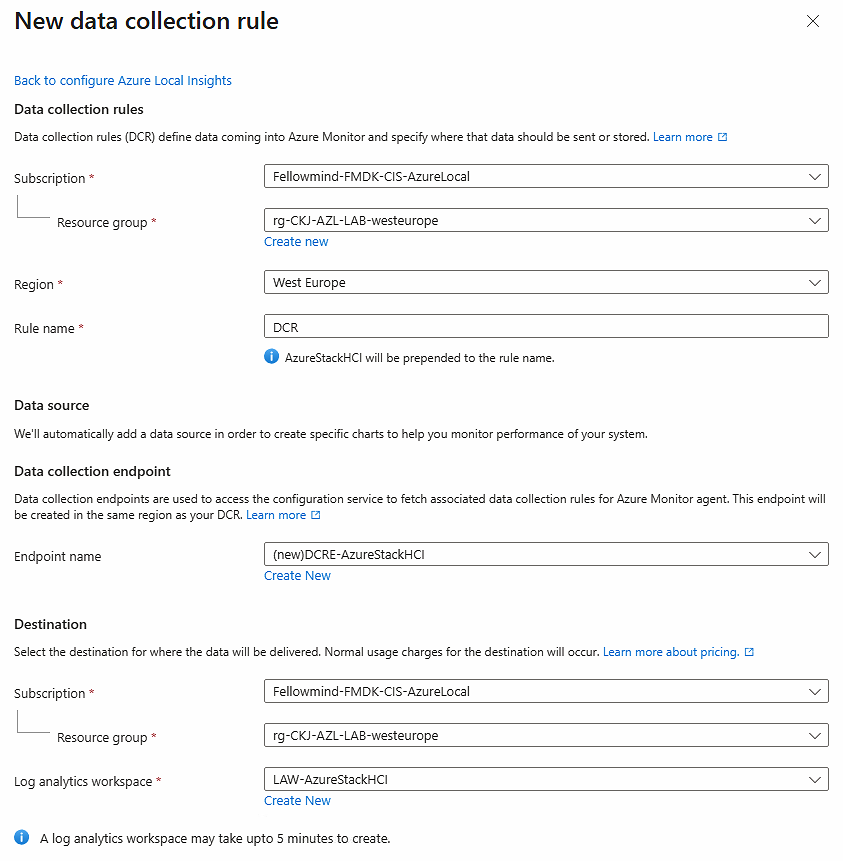 Fill out the creation form. You also need to let the wizard create a new data collection endpoint and log analytics workspace unless you have existing resources in a central management subscription, then you should use those existing resources
