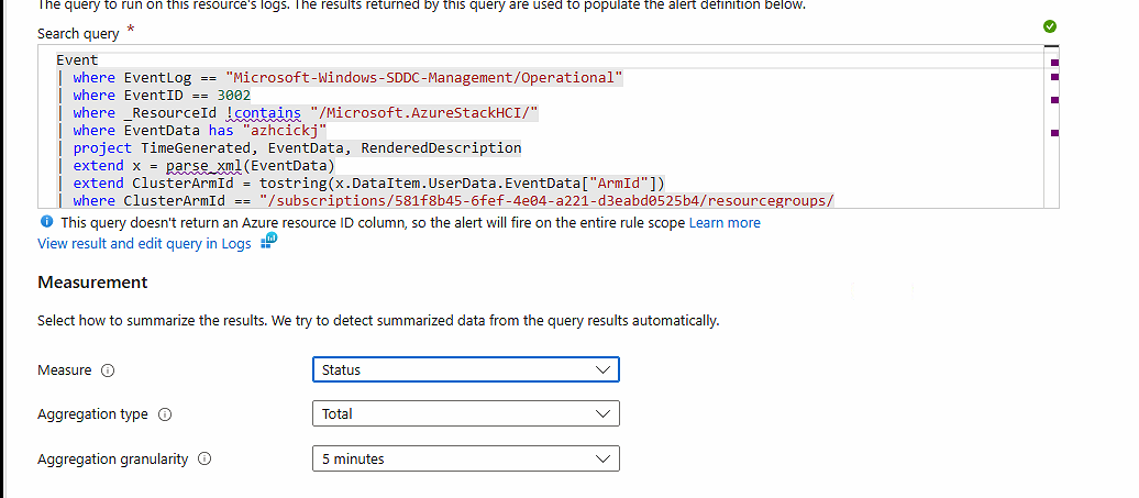| where ClusterArmId == "/subscriptions/581f8b45-6fef-4e04-a221-d3eabd0525b4/resourcegroups/rg-ckj-azl-lab-westeurope/providers/microsoft.azurestackhci/clusters/azhcickj"