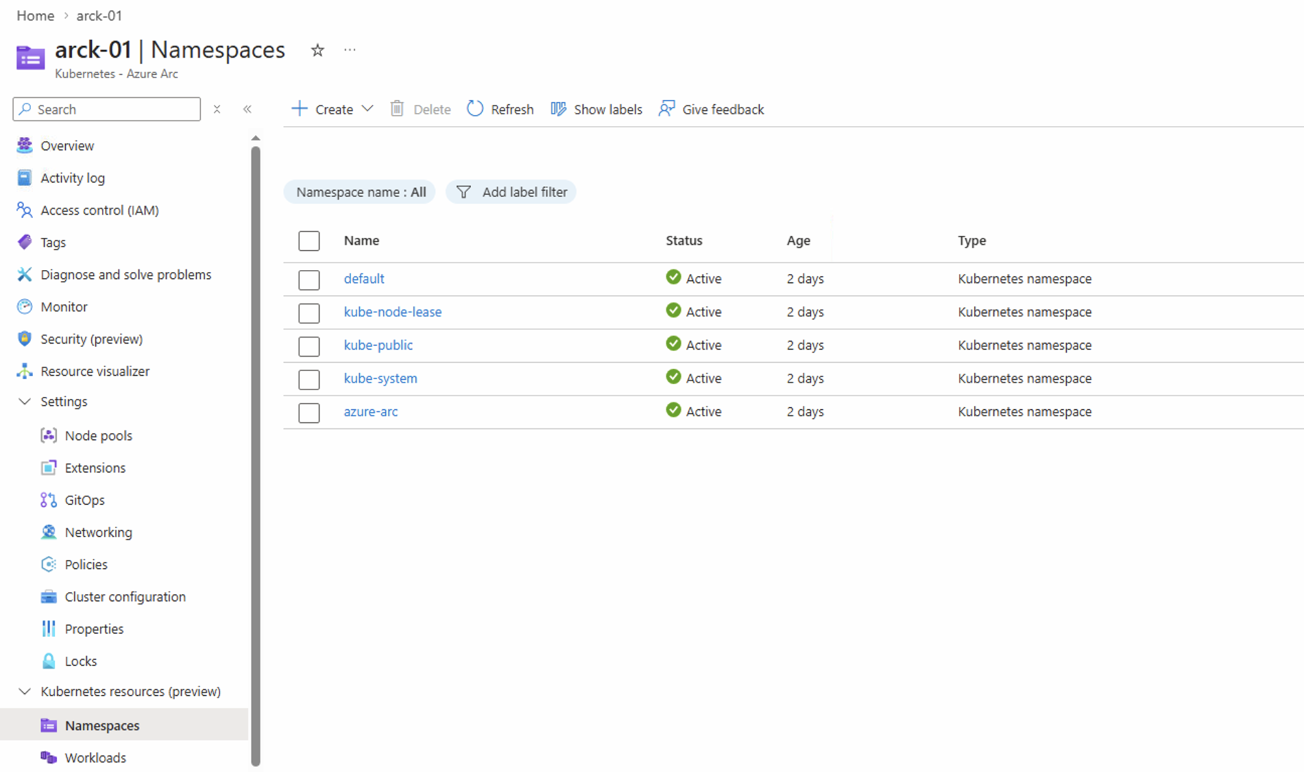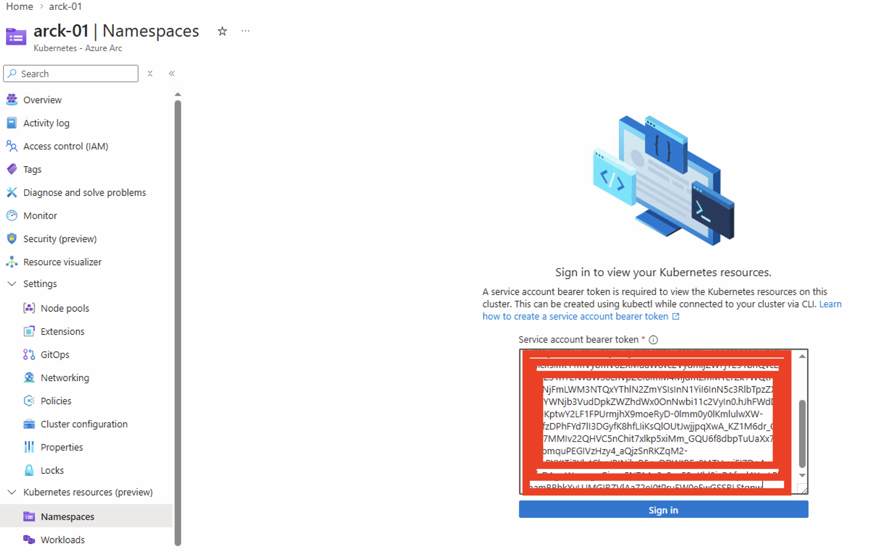 Back to Azure Portal, locate the Kubernetes cluster and select Namespaces, now insert the bearer token.