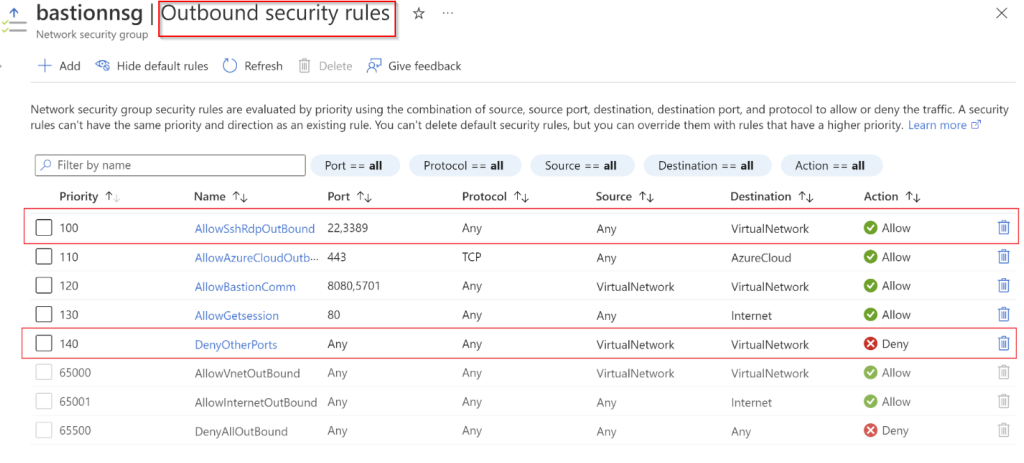 You can limit port access by only providing access to port 22/3389 outbound from Bastion hosts. To restrict port access, you must deploy the following NSG rules on your AzureBastionSubnet to allow access to select ports and deny access from any other ports. Do that by creating a new NSG, define outbound rules as shown in the image, and attach that NSG to the subnet there you deployed Azure Bastion instance.