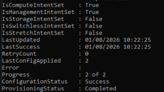 Set-NetIntentRetryState -ClusterName HCICLUs01 -Name compute_management -NodeName NODE01 - Check Network Intent status (should be completed without errors on node 1, it can take 2-5 minutes to complete)