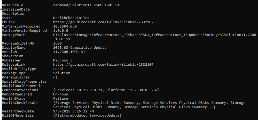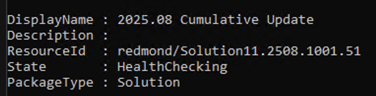 Get-SolutionUpdate -Id "redmond/Solution11.2508.1001.51" | ft Version,State,UpdateStateProperties,HealthState