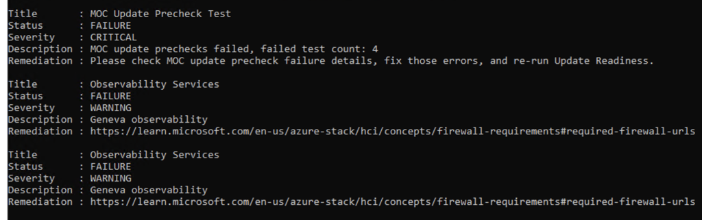 If the update validation is displaying as healthy or warning, but when the actual update starts, it is failing in the pre-check validation state right before applying the update, here is what to do (Steps are written as comment in the PowerShell commands)