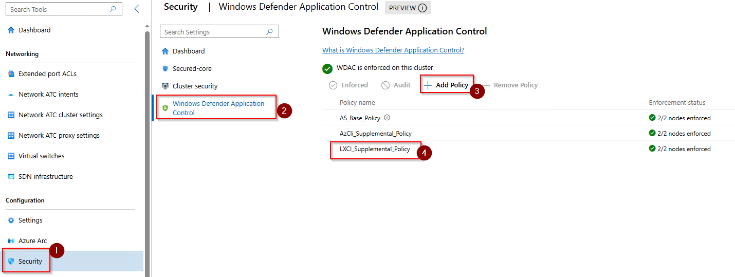 If Lenovo XClarity fails with info about missing WDAC policy, get the XML file that XClarity shows, and import it as a policy here: (the XML file needs to be copied to the C drive of first node in the cluster, before you can select it for import)