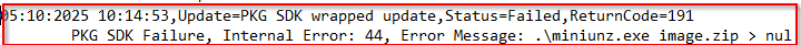 Update=PKG SDK wrapped update,Status=Failed,ReturnCode=191