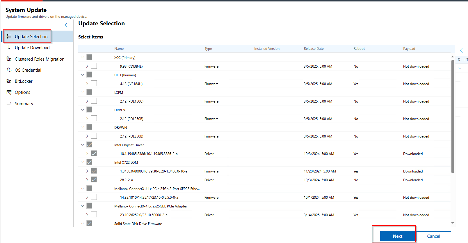 - You can now see that the system have selected the updates to be downloaded and installed. Select Next: