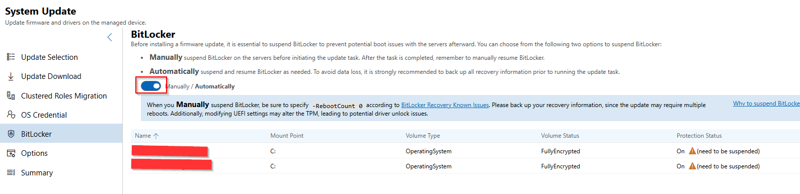 - Select Automatically so Lenovo controls BitLocker pause and resume states: