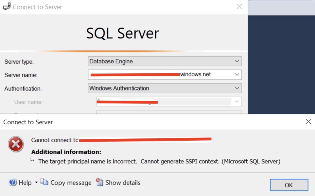 But when testing using SQL Studio Management, it would fail with the following error: The target principal name is incorrect. Cannot generate SSPI context