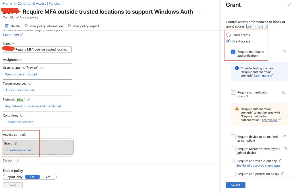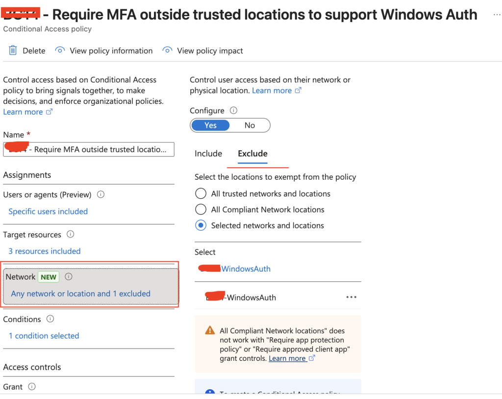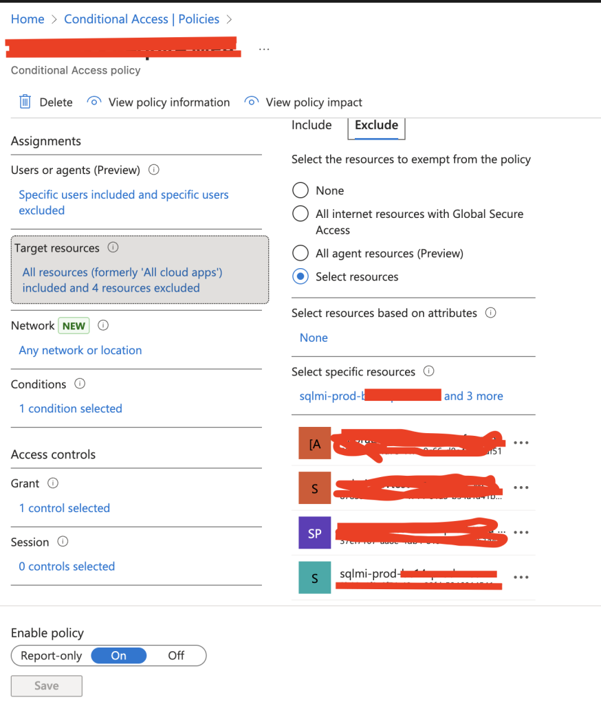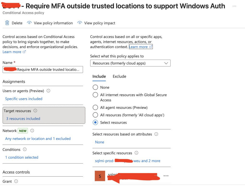 The new CA policy targets all users, but only targets the app registrations for the SQL Managed Instance. Then we exclude the public IP of our trusted IP addresses and grant access if MFA is fulfilled.