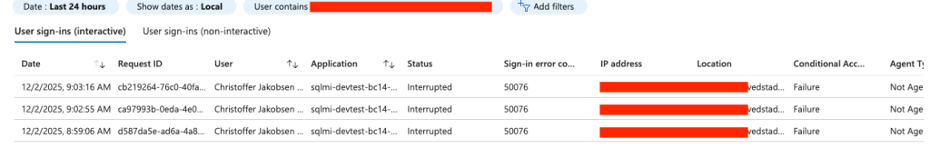 I saw on my user in Entra ID, that I did had some sign-in log errors. Users on this article startes that non-interactive user sign-ins was showing the blockings, but I could see them on interactive user sign-ins: