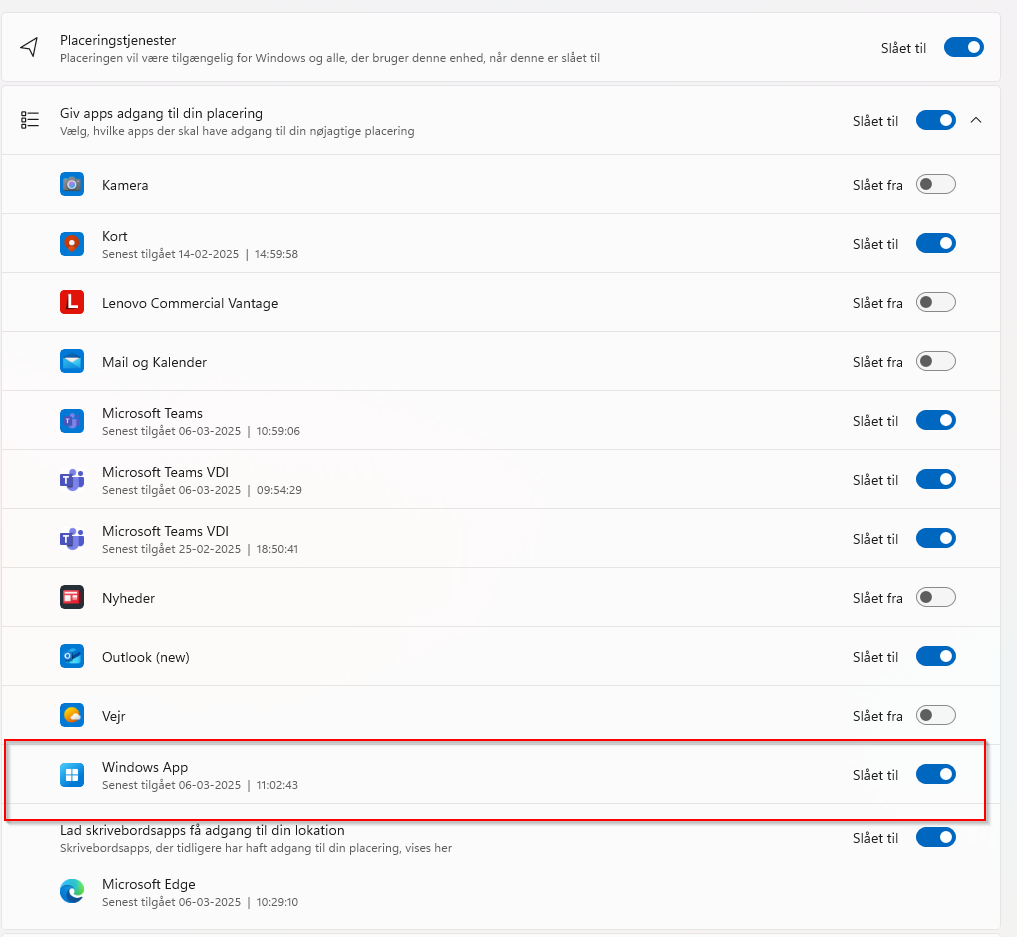 To validate the local device, go to Settings, Security and Anonymity, and then Location. Make sure Location services are enabled for Windows App (should be set by the policy we created in Intune in earlier steps).