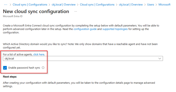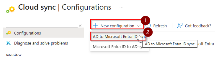 In cloud sync, chose to setup new configuration – AD to Entra ID: