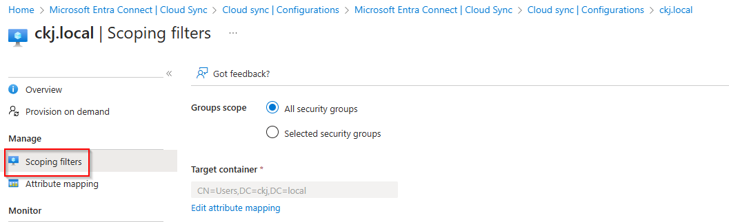 After initial creation that is much similar the configuration of the other way around, you can now go into filtering of which security groups should be synced from Entra ID to local AD (or leave it at “all security groups” – if you have a lot of groups not needed to be synced to local AD, leaving it at default would be a bad approach to take)
