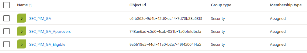 - Create 2 standard assigned groups in Entra ID, call them: SEC_PIM_GA_Eligible and SEC_PIM_GA_Approver