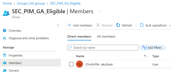 - Add direct members to this group that approve PIM requests. Note that the same user can both be eligible for an elevation and approver at the same time, but this user will not be allowed to approve own requests, therefore another user is required for approval flow to work.