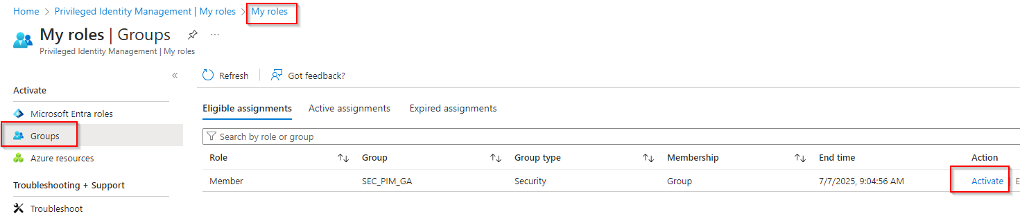 - Go to the group in Entra ID called: SEC_PIM_GA_Eligible