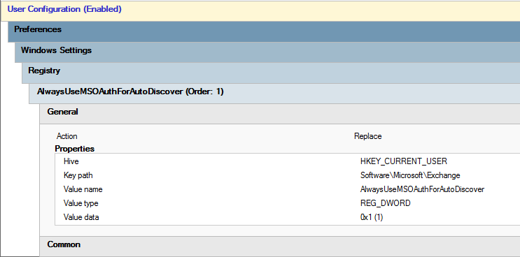 Create the following registry key to force Outlook to use a newer authentication method for web services, such as EWS and Autodiscover. Microsoft recommend that users force Outlook to use Modern Authentication.