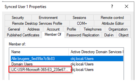 Initial, the user is not member of the cloud synced group, in Active Directory, but after next sync for the Entra ID to AD connector, the user in Active Directory is updated with the membership of the cloud synced group.