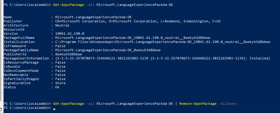 Get-AppXPackage -All Microsoft.LanguageExperiencePackda-dk | Remove-AppXPackage -AllUsers