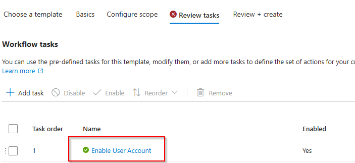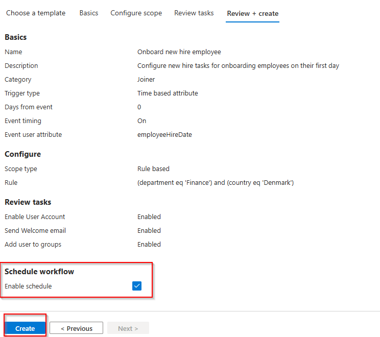 On the “review + create” page, enable the schedule for the workflows and create it: