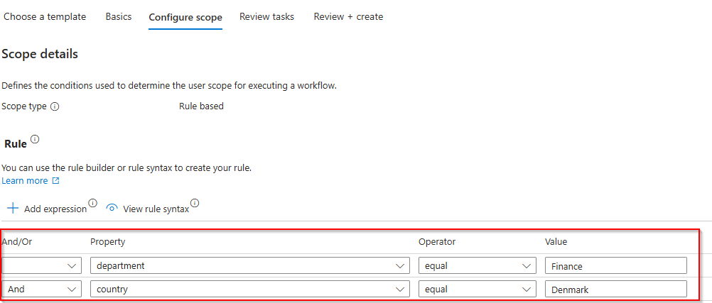 On the first page in the wizard for template deployment, I leave everything default, but on the “Configure scope”, I setup a few rules to make sure it only applies users within wanted scope: