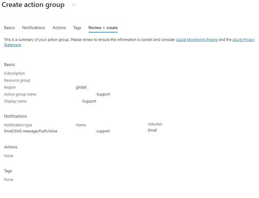- Select Review+Create, then create the action group.