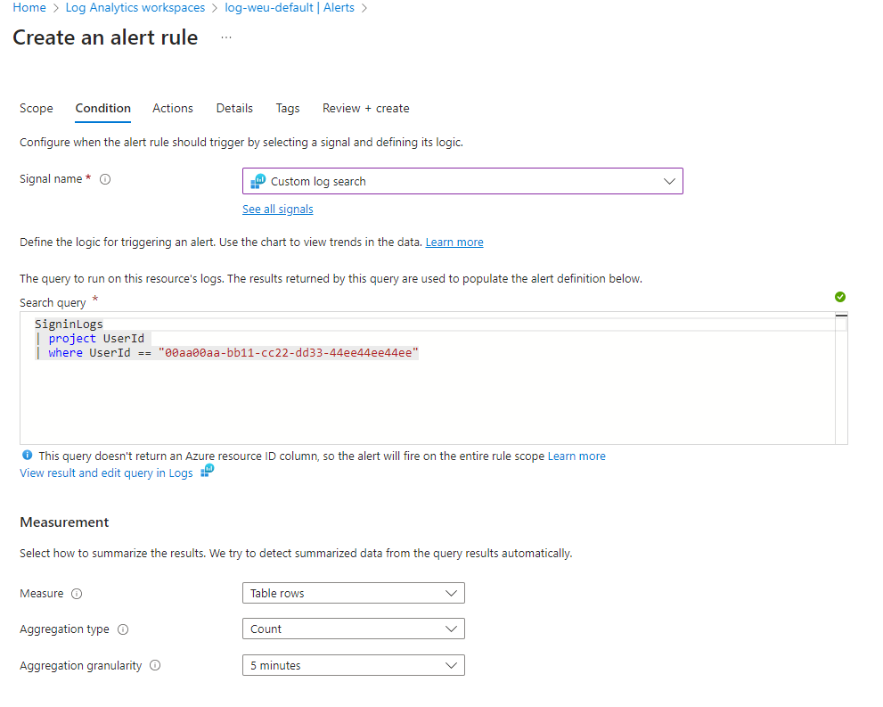 - Under Condition, select “Custom log search” under Signal name.