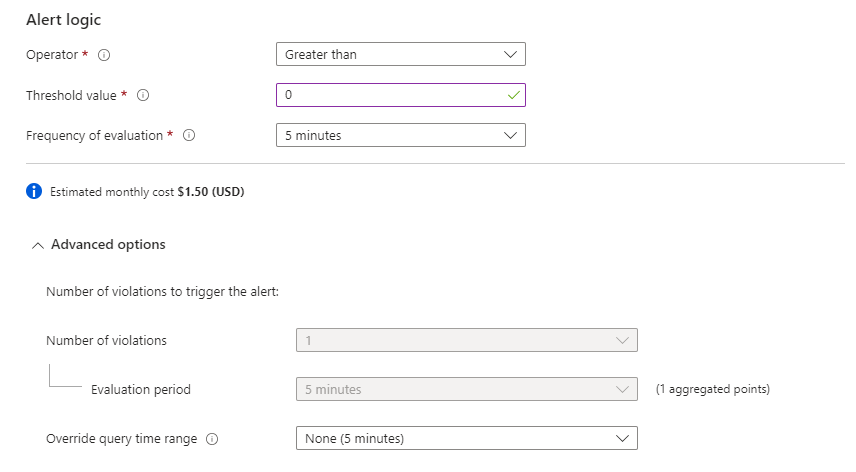 - Under Alert logic, enter the following: