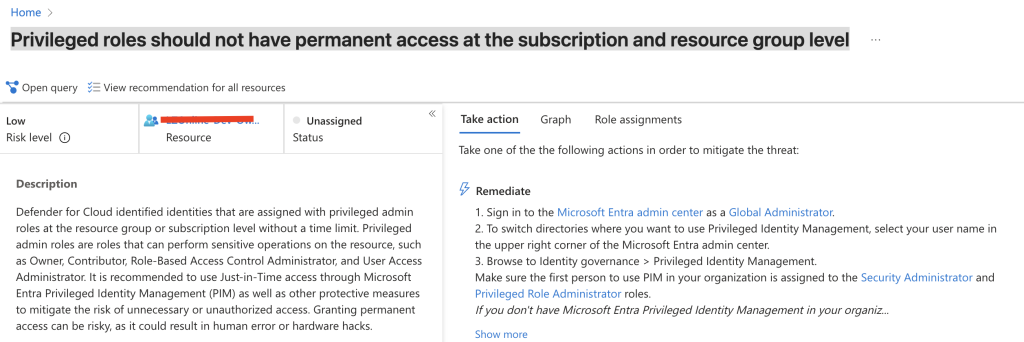 Now we can see the assessmentKey, which corresponds to a security assessment object id. In my test, I was using “Privileged roles should not have permanent access at the subscription and resource group level”. Below picture shows the recommendation in Azure Portal.