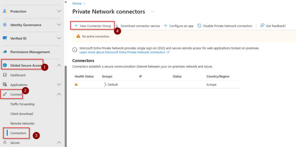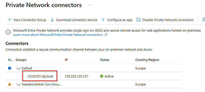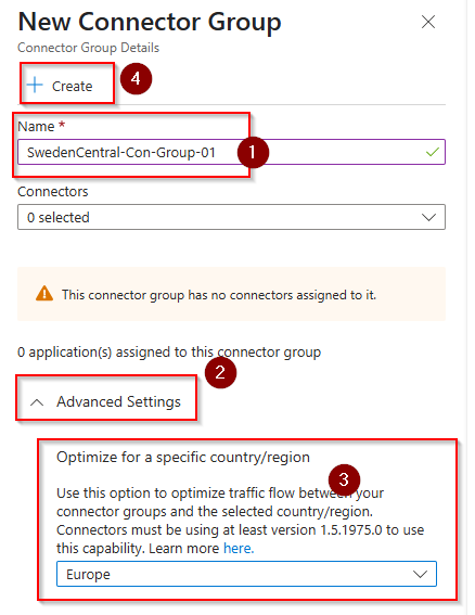 Create a new connector group. This group should contain two or more connector services (agents) very close to the applications you want to secure access to. If target application is hosted on-premises, you should create two or more member servers in this location and install the connector service software on these member servers.