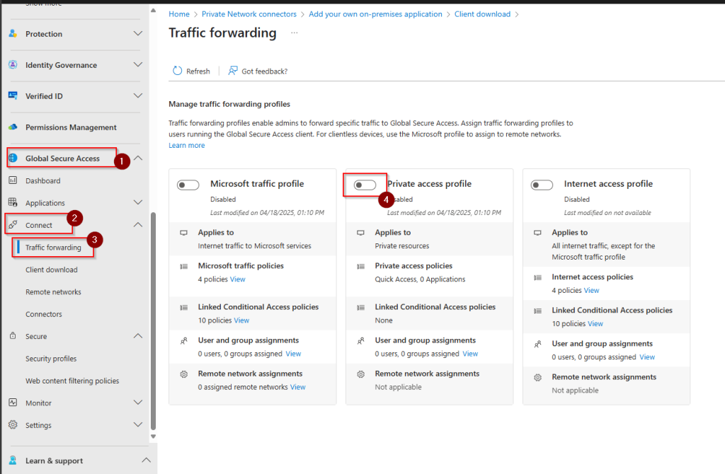 Navigate to Global Secure Access < Connect < Traffic forwarding