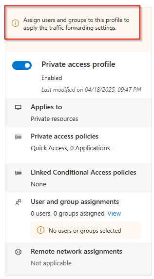 Select the View and then assign a group to this profile (create a new security group in Entra ID with a name that follows your normal naming convention. This group should contain all users that will be subject for private access)