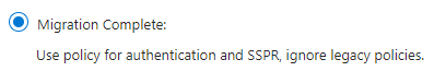 Now that you have enabled all the new policies, disabled legacy SSPR and legacy MFA (wait 2-5 minutes), you can finish the migration on the Authentication Methods, Policies, Manage Migration page: