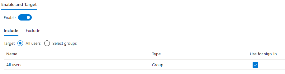 On the same page, please enable all relevant methods. In this example, Microsoft Authenticator, Third-party OATH Tokens (etc. OTP in RDM used by Fellowmind), Temporary Access Pass, SMS and email are enabled. If you need to include only some users, please use a group to apply these to. Remember that these both enable MFA methods and require users to configure methods for the enablement of self-service password reset.