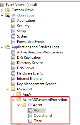 Open Event Log and navigate to Windows Logs, Applications and Services Logs, Microsoft, AzureADPasswordProtection and then DCAgent:
