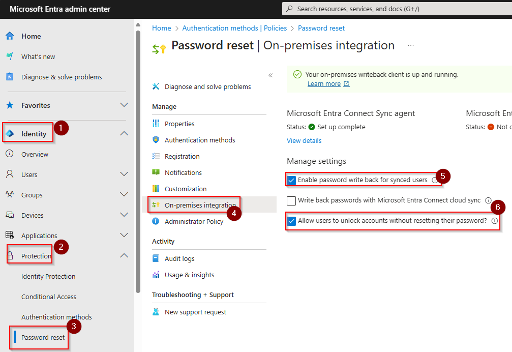 In Entra ID, go to Identity, Protection, Password reset and then On-premises integration.