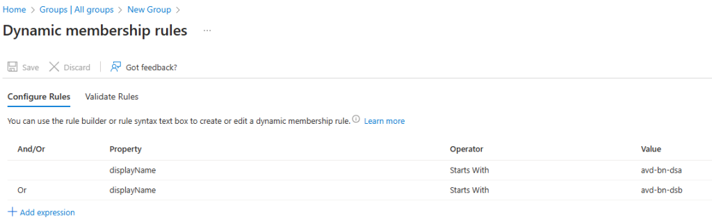 You can use multiple expressions, but the simple configuration is to use the start of the name of the session hosts in our host pool, since we use DevOps pipelines to control deployment of session hosts and a controlled naming convention: