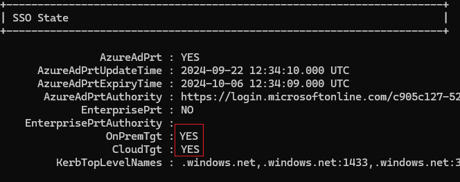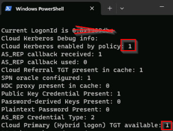 To verify that the policies are successfully applied, use the commmand klist cloud_debug. That command shows the available TGT that can be used. Use the command dsregcmd /status. The SSO State section should show that the OnPremTgt and the CloudTgt are available. Once verified, you should be able to browse a fileshare that the user have access to, without being prompted for credentials.