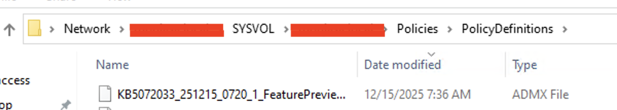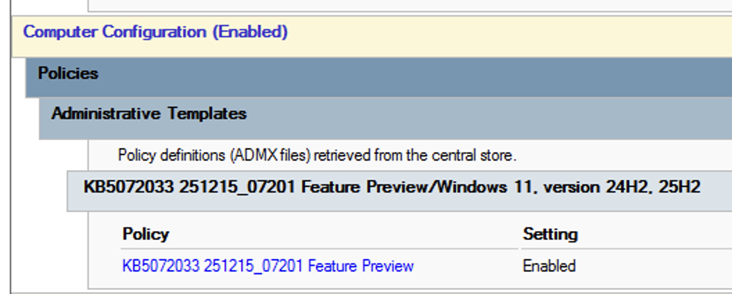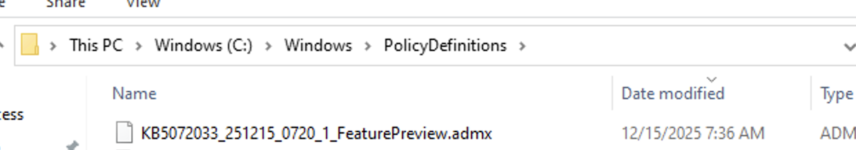 You will need the GPO template. You can download it from here: Windows 11 24H2, Windows 11 25H2 and Windows Server 2025 KB5072033 251215_07201 Feature Preview.msi