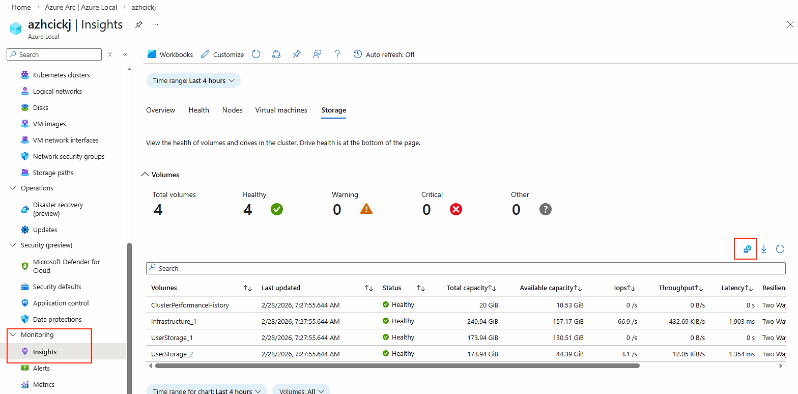 - Navigate to your Azure Local instance, when Monitoring > Insights. I’m selecting Storage view for this task. Select the small icon for LAW (highlighted with red on the picture below)