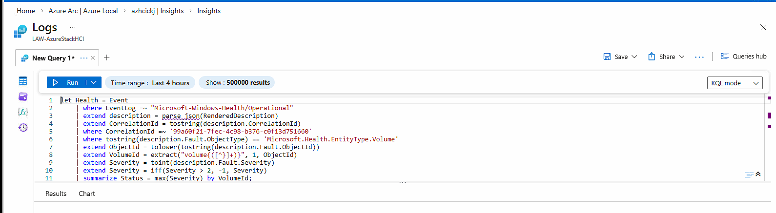 | where ClusterArmId == "/subscriptions/581f8b45-6fef-4e04-a221-d3eabd0525b4/resourcegroups/rg-ckj-azl-lab-westeurope/providers/microsoft.azurestackhci/clusters/azhcickj"