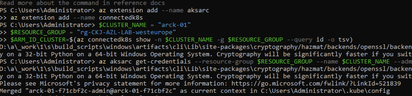 az aksarc get-credentials --resource-group $RESOURCE_GROUP --name $CLUSTER_NAME --admin