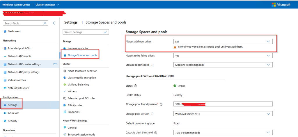 Once I came across the PowerShell command “Get-PhysicalDisk”, I could see that the storage pool had added the new M.2 disk we had installed the OS on. Of cause this failed because the disk was in use, but never the less, the disk was in the storage pool. I could also see it in Windows Admin Center where I could see the M.2 disk in the disk inventory overview.
