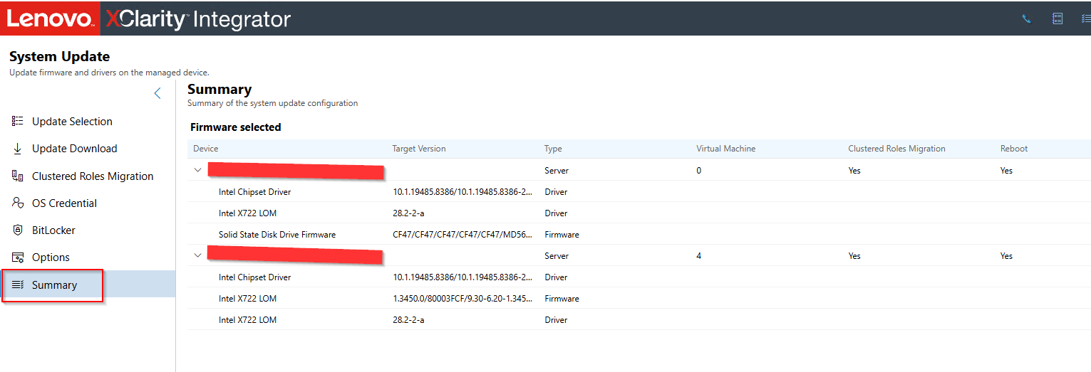 On Lenovo servers, all nodes within the stack can be updated using Windows Admin Center and the Lenovo XClarity Integrator Compliance and Updates: