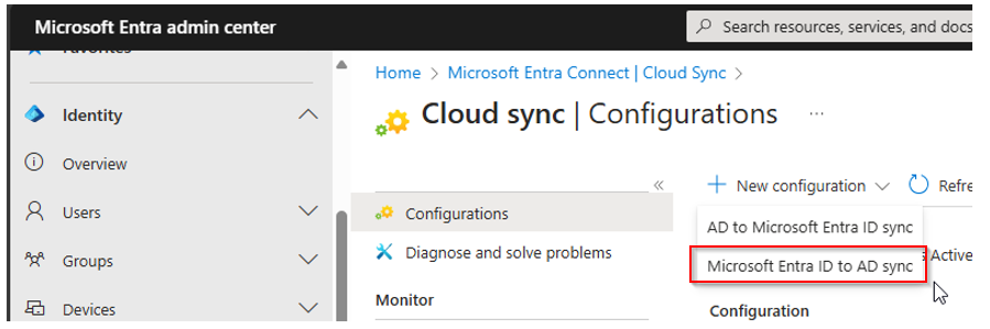 Create a new sync configuration, from Entra ID to Active Directory: