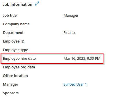 Let the user sync to Entra ID and monitor that Employee Hire date is filled: